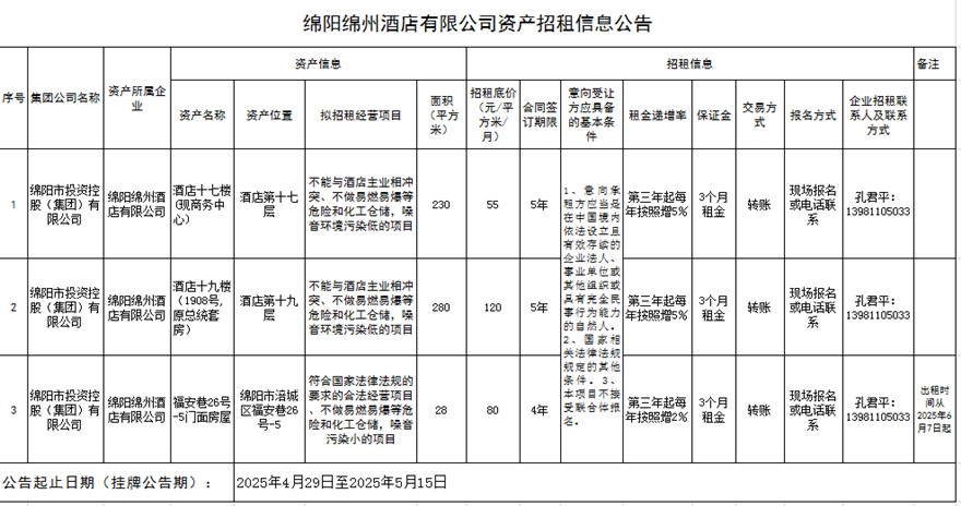 綿陽綿州酒店有限公司資產(chǎn)招租信息公告