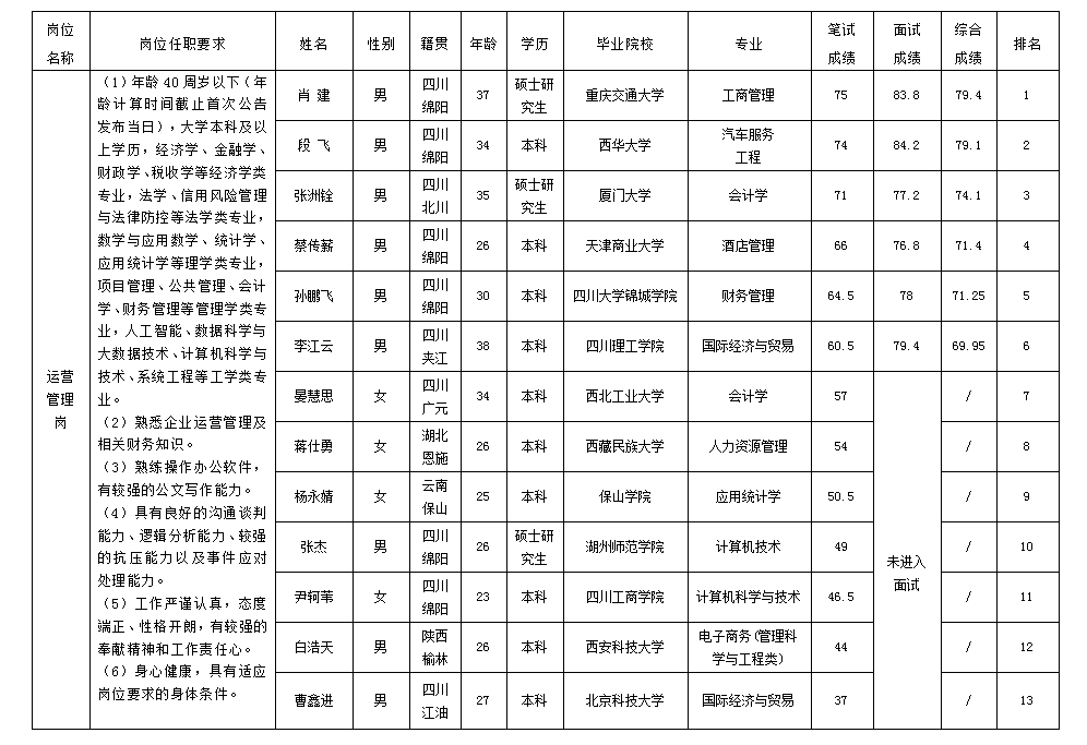【公開招聘】綿陽市投資控股(集團(tuán))有限公司關(guān)于招聘運(yùn)營管理崗崗位測(cè)試成績的公示